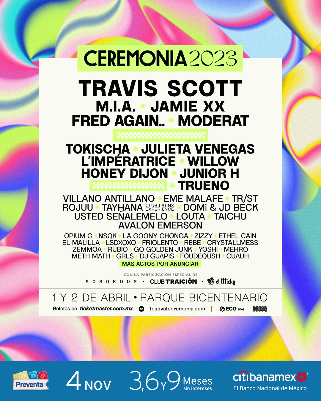 El pasado 1 de noviembre, se dieron a conocer los cantantes que serán parte del espectáculo en la Alcaldía Azcapotzalco, entre los head liners se lee el nombre de Travis Scott, M.I.A, Jamie XX, Fred Again y Moderat.