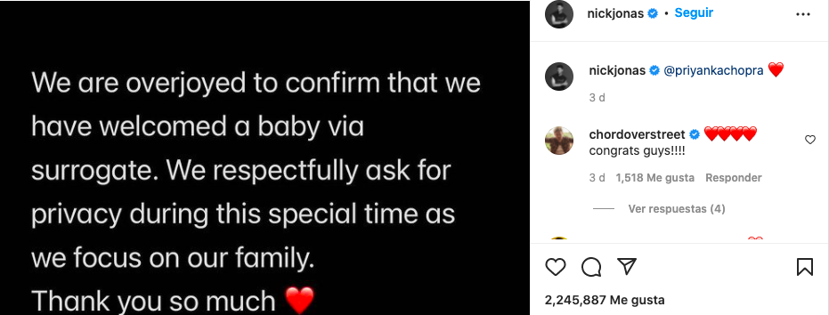 Nick de 29 años y Priyanka de 39, escribieron el siguiente mensaje a sus seguidores de Instagram: “Estamos llenos de alegría de confirmar que hemos dado la bienvenida a un bebé vía subrogado. Respetuosamente les pedimos privacidad durante este momento tan especial para enfocarnos en nuestra familia. Muchas gracias”.
